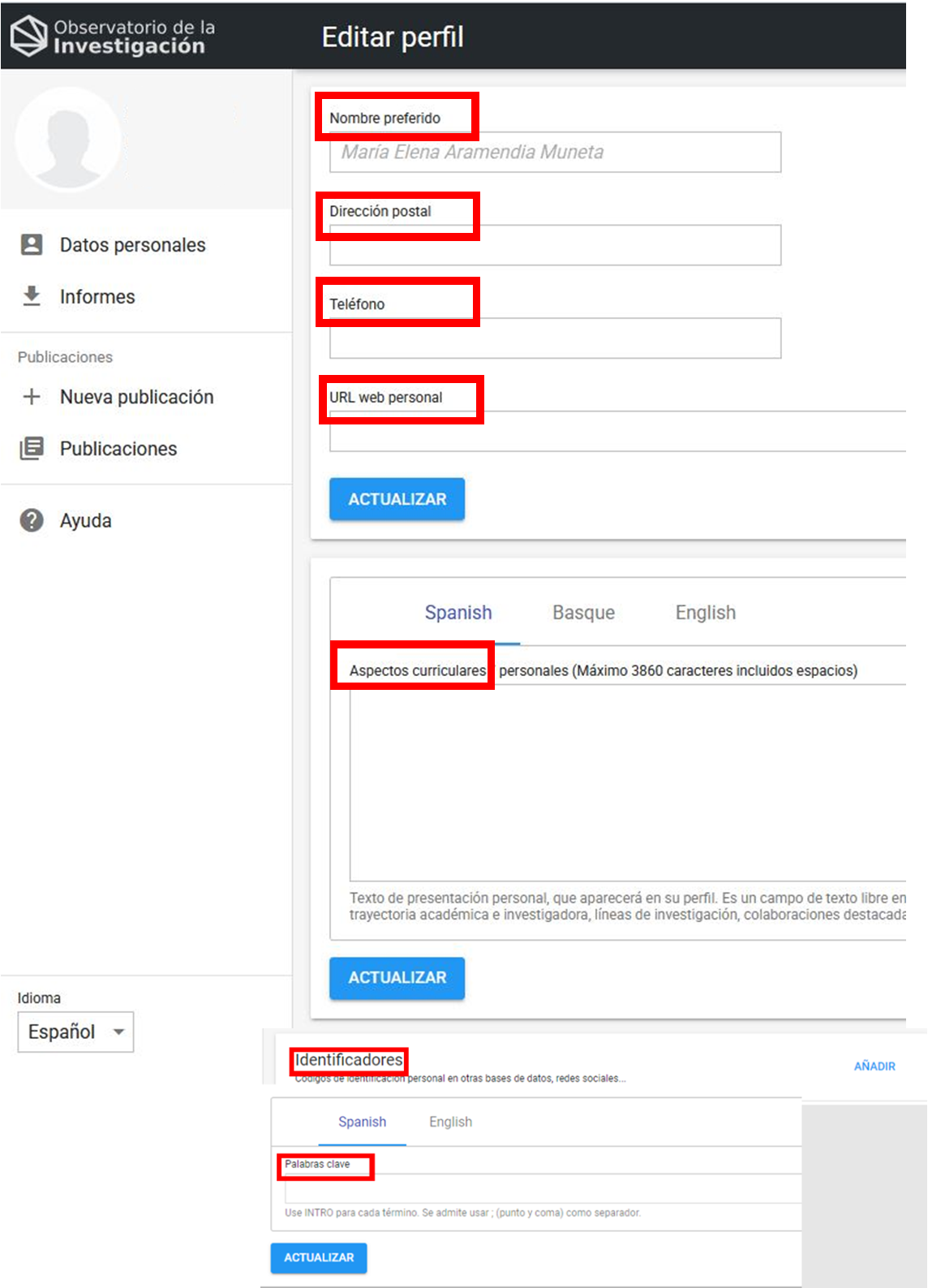 Desde el área de Informes en la página del autor/a, el presonal investigador puede: