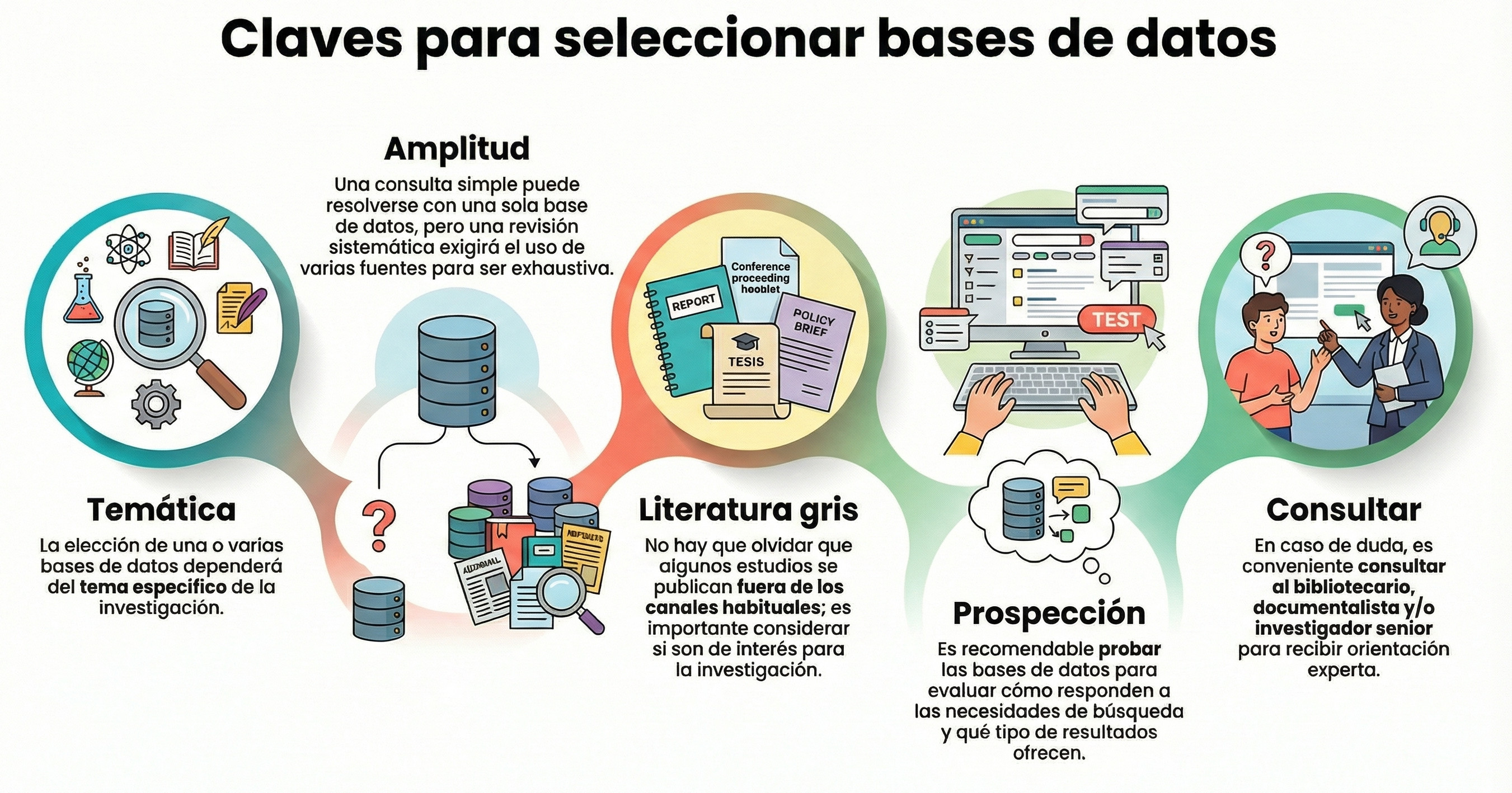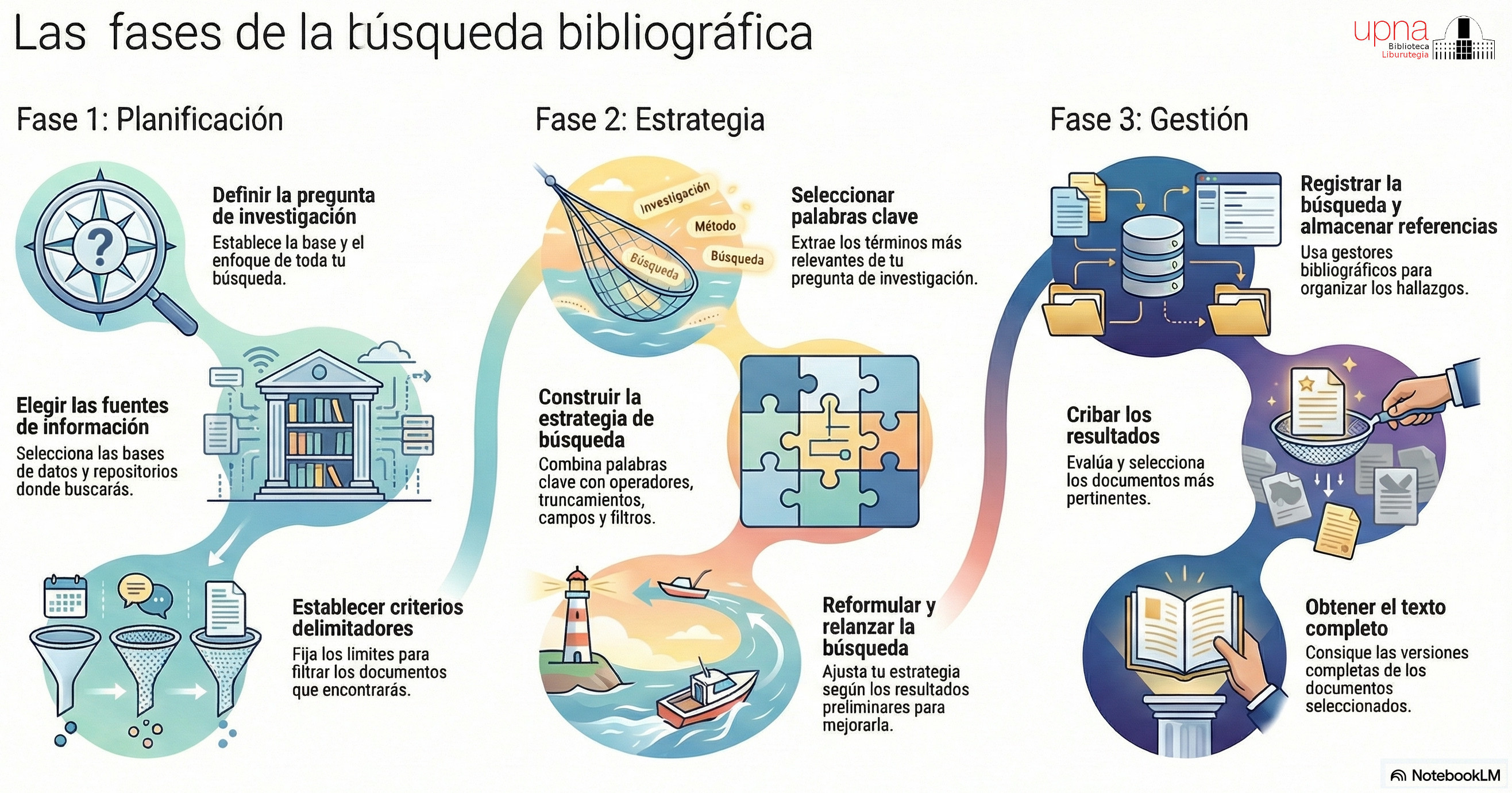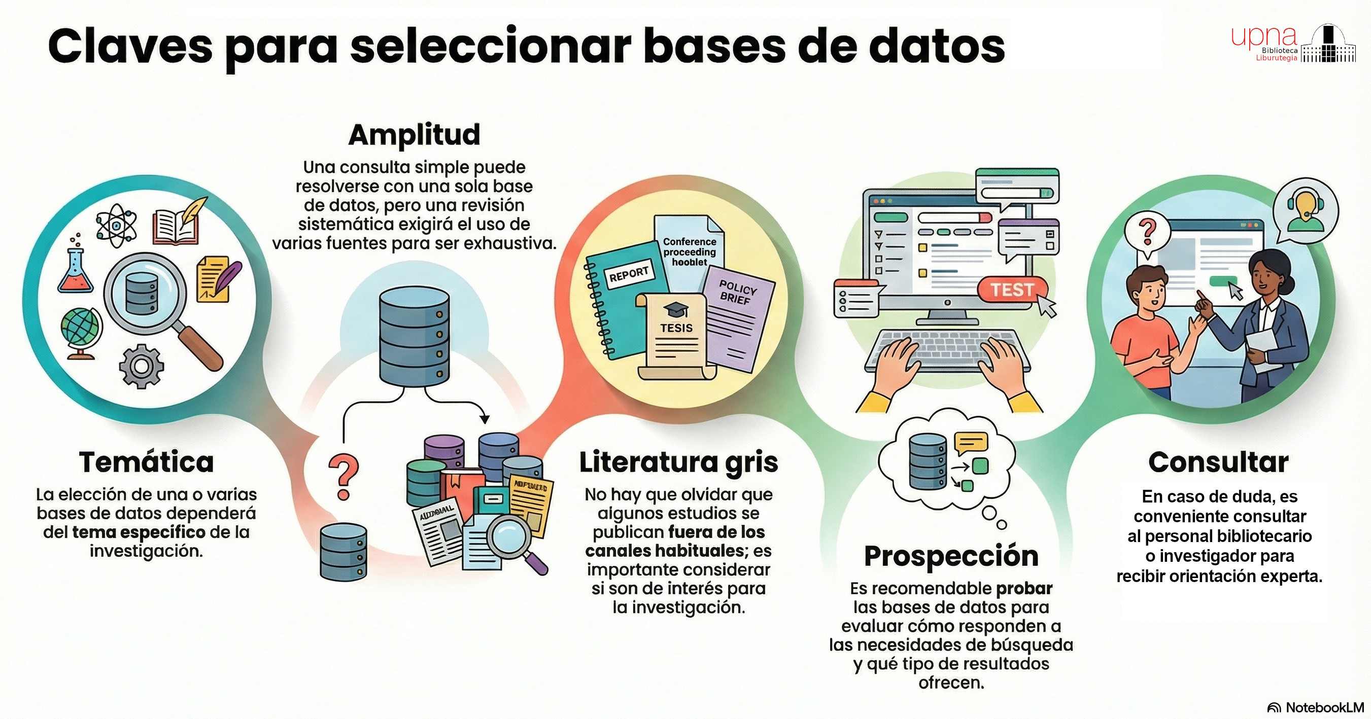 Por lo general, realizaremos la búsqueda en bases de datos bibliográficas que contengan documentos afines a nuestro tema de estudio. En las Guías BUPNA, creadas y mantenidas por la Biblioteca de la UPNA, encontrarás guías por materias en las que podrás ver recursos de interés de cada disciplina, entre ellos, las principales bases de datos bibliográficas.