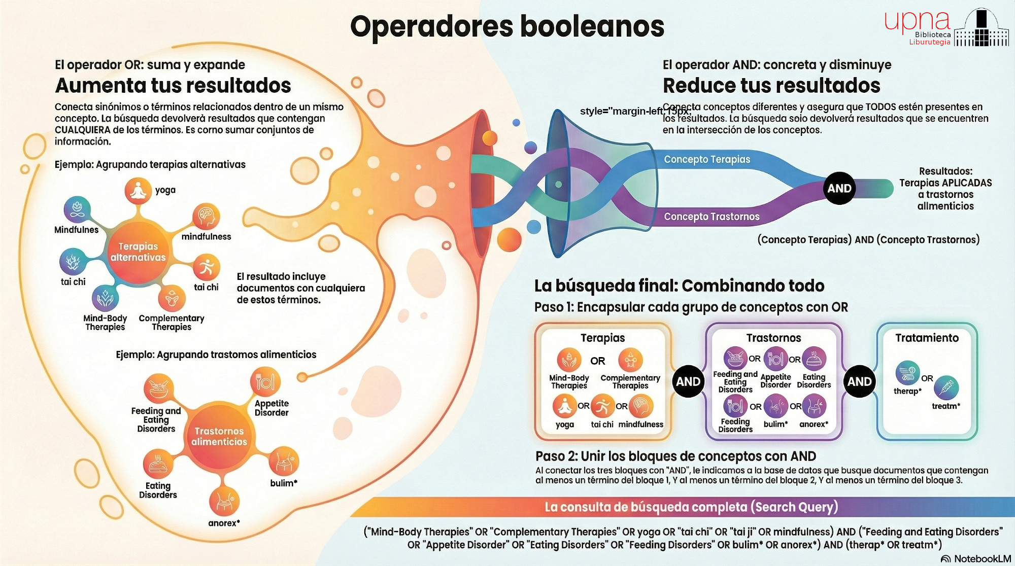 Una búsqeda con operadores booleanos, primero agrupará, uniéndolos con OR y encerrándolos entre paréntesis, los términos similares o equivalentes que corresponden a las diferentes facetas. Luego unirá las diferentes facetas, es decir, cada conjunto de paréntesis mediante el operador AND. El ejemplo que hemos puesto anteriormente quedaría así: